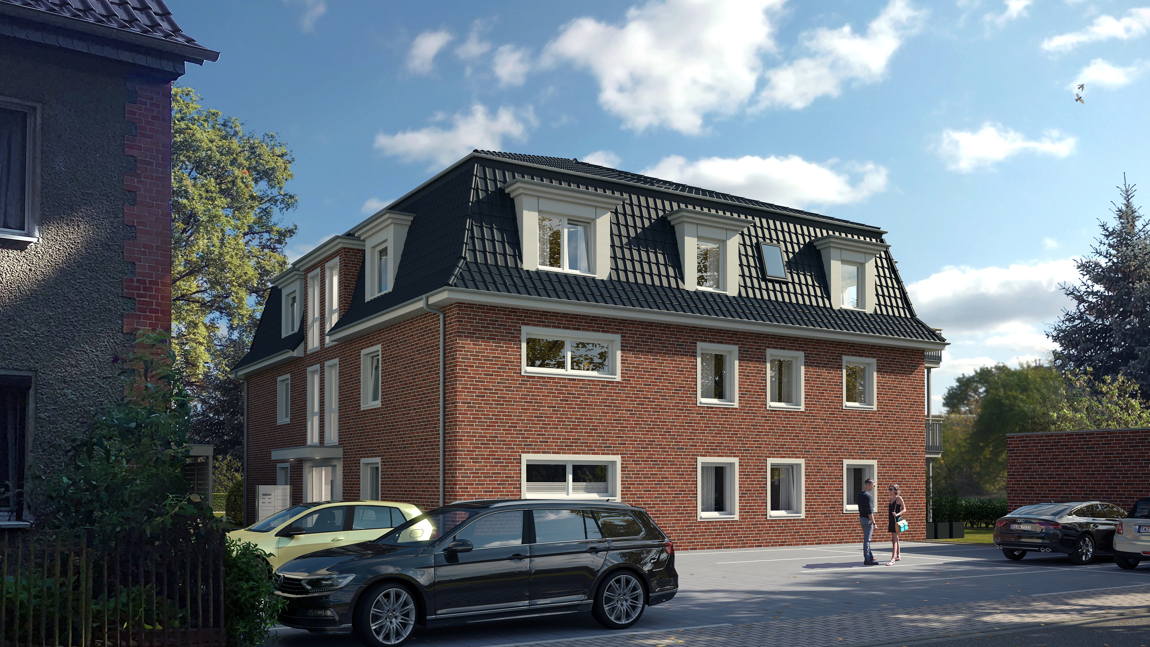 In Hangelsberg bei Berlin entstand ein modernes Mehrfamilienhaus mit sechs Wohneinheiten, das städtischen Komfort mit naturnahem Wohnen verbindet. Das klare, harmonische Fassadenbild mit hellen Ziegeln und großen Fensterflächen fügt sich elegant in die Umgebung ein. Der Entwurf legt Wert auf durchdachte Grundrisse, viel Tageslicht und eine angenehme Wohnatmosphäre.